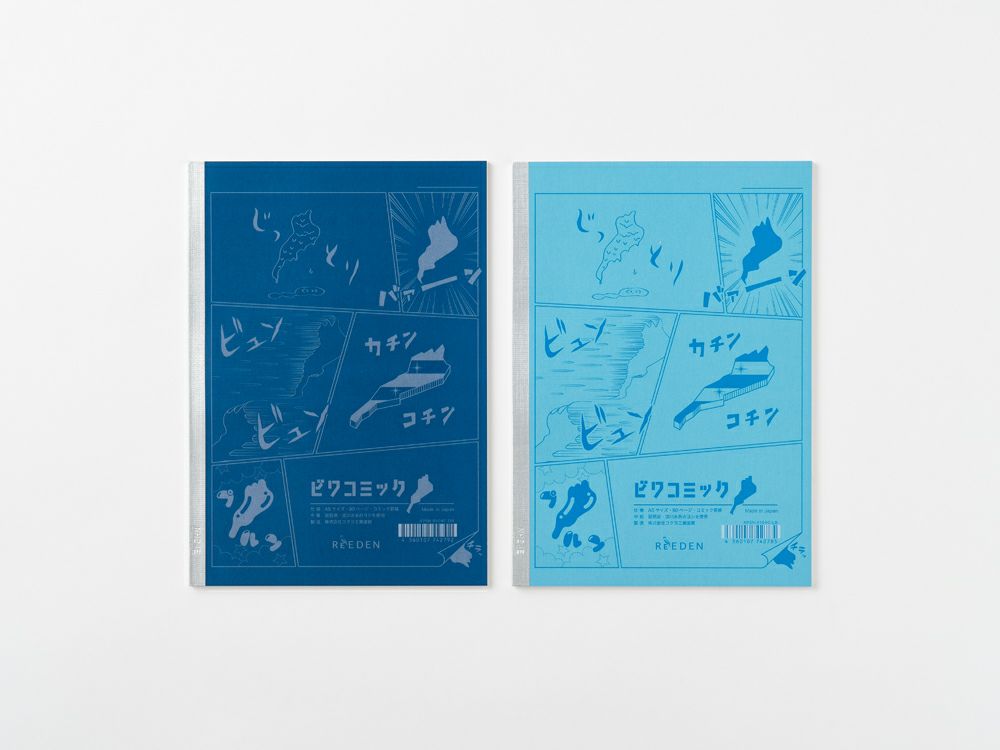 水色と紺色の表紙のノートを2冊セットにしました。表紙デザインにさまざまな姿に変身したコミック調のユニークな琵琶湖をあしらったノートです。表紙は疑似エンボスニスで印刷されており、ノートを傾けると光の反射で、琵琶湖と絵柄が躍動感をもって現れます。
