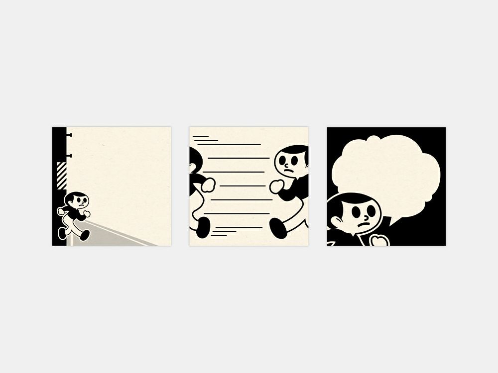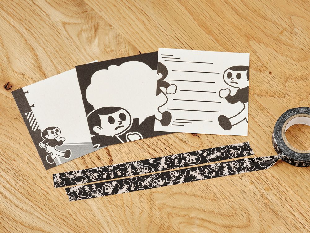 色んな方向に飛び出すポーズの無数の「とび太くん」をモノトーンでデザインしたマスキングテープです。上下を貼り合わせると絵柄がつながります。琵琶湖・淀川水系のヨシを使用した風合いのあるヨシ紙に、走るとび太くん・吹き出しのとび太くん・電柱のそばで交通安全を見守るとび太くんをデザインした3柄(各1枚)のヨシ紙のメッセージカードがセットになっています。