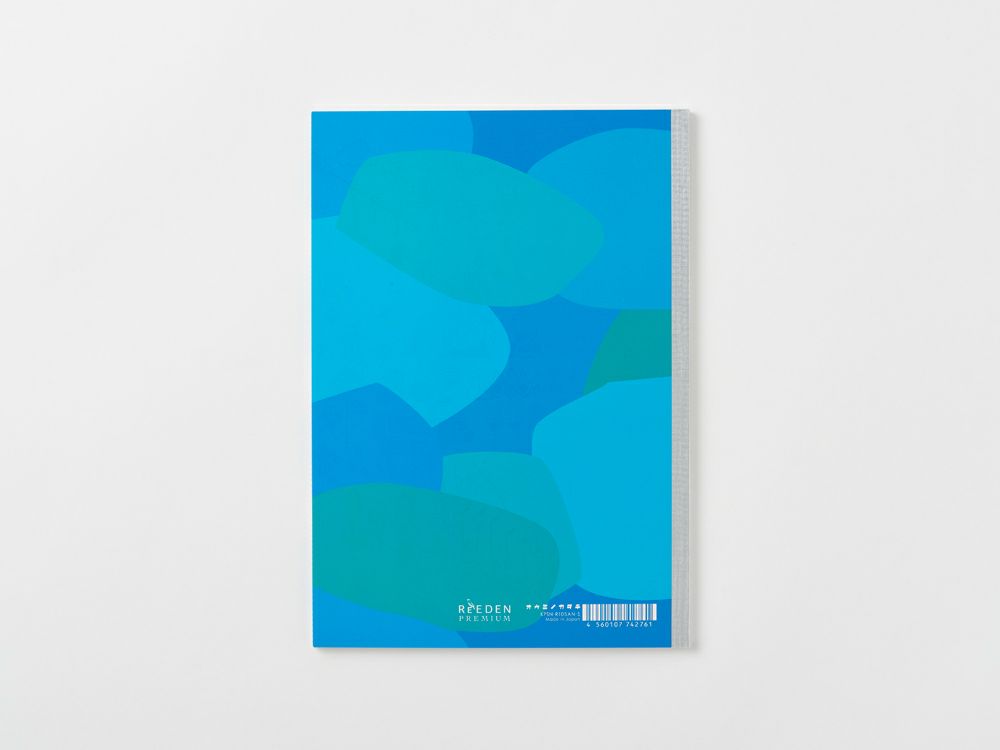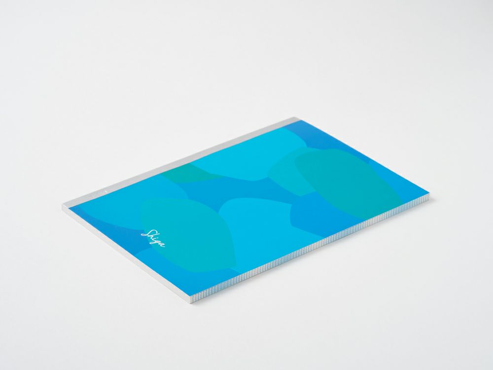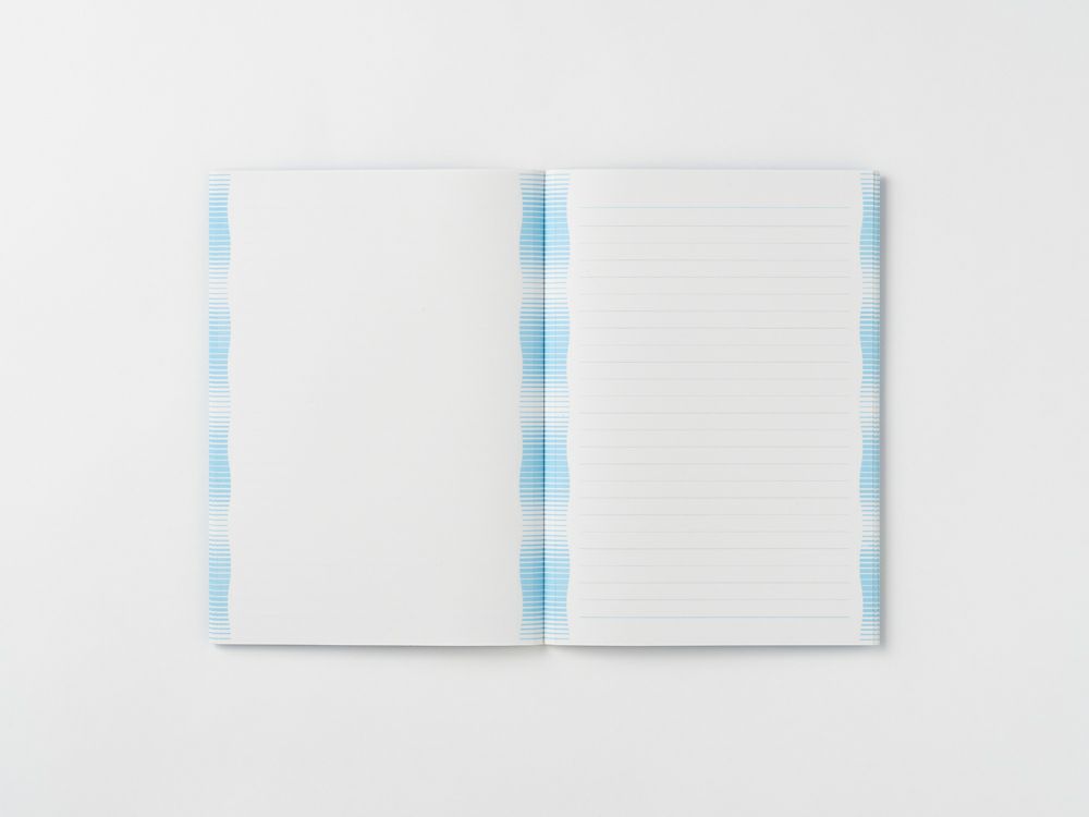 片面印刷からなる中紙は、切り離しのミシン目、中央を二分割する目印、ちょうど3つに折れる目印が施されています。左右には琵琶湖の湖面の揺らめきを表しており、ノートの小口からもそのグラデーションが見て取れます。