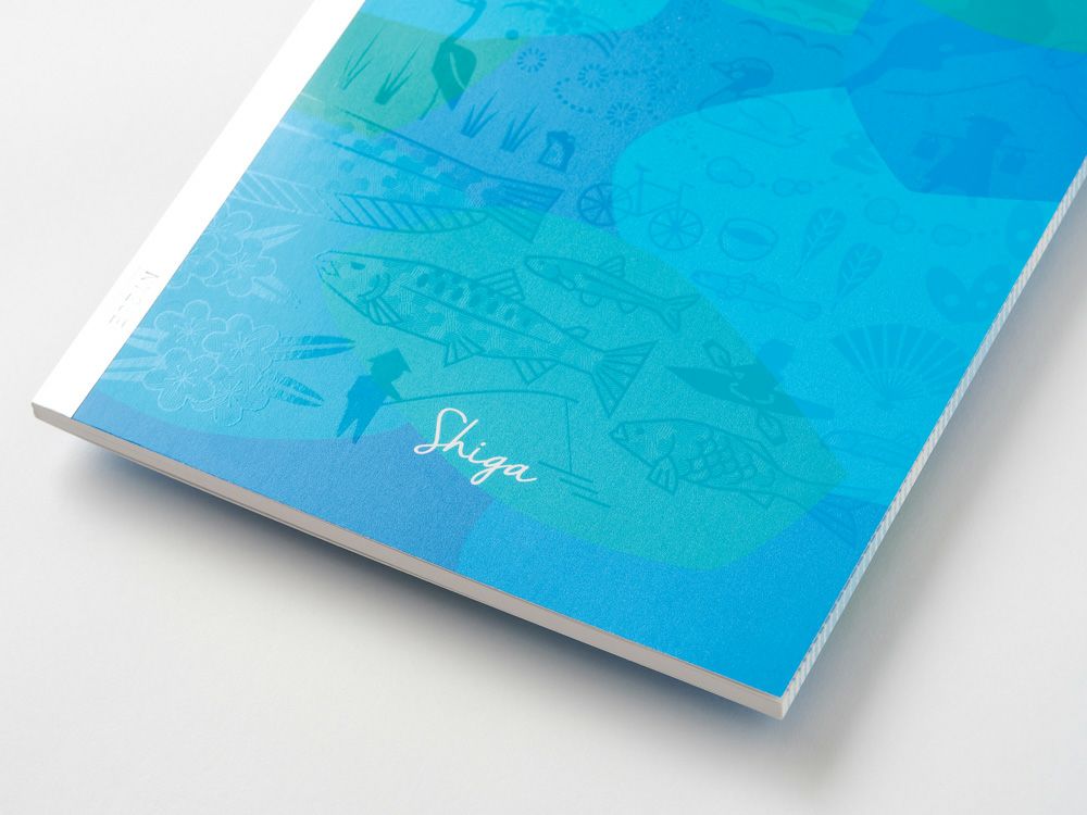 表紙は疑似エンボスニスで印刷されており、傾けると光の反射で、表紙から魅力溢れる滋賀県の特産品やレジャーなど様々な「オウミノカタチ」が現れます。